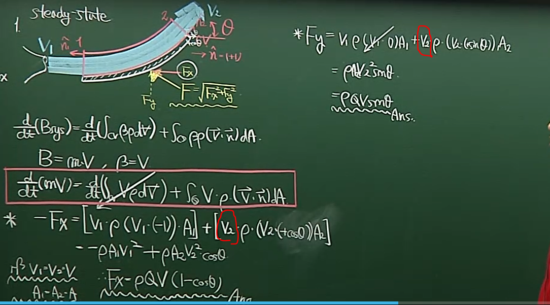 질문에서 언급된 빨간색 친 부분에서 cos θ나 sin θ를 곱하지 않는 이유는 바로 이 점에 있습니다. 레이놀즈 수송 정리에서 속도 성분 V는 제어면을 통과하는 성분만을 고려합니다. 따라서, V와 n의 내적을 통해 이미 각도 요소가 반영된 것입니다. 이를 다시 cos θ나 sin θ로 고려할 필요는 없습니다.